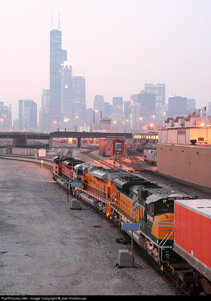 | A trio of the heritage locomotives leave Canal Street yard, ducking by downtown Chicago, where they will turn west en route to Salt Lake City. |
