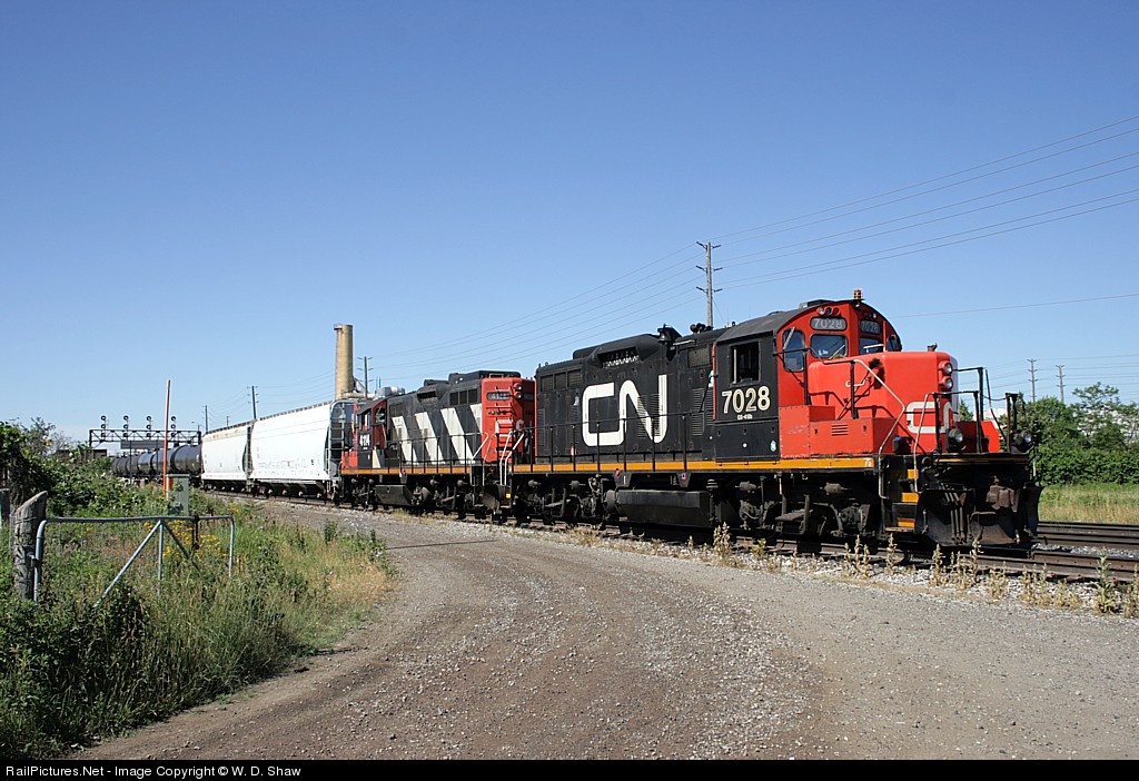 | A pair of Geeps switch the south side of Oakville Yard at 9th Line. Both these Geeps were built to run long hood forward. 4114 has been modified to run short hood forward while 7028 is one of a series that retained the LHF setup in spite of the short hoods being chopped. |