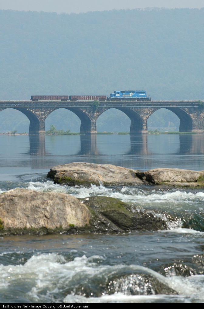 An Ex-conrail SD40-2 with two gondolas heads east towards Harrisburg Yard as it crosses the Susquehanna River on a hazy summer morning. Nikon D70.