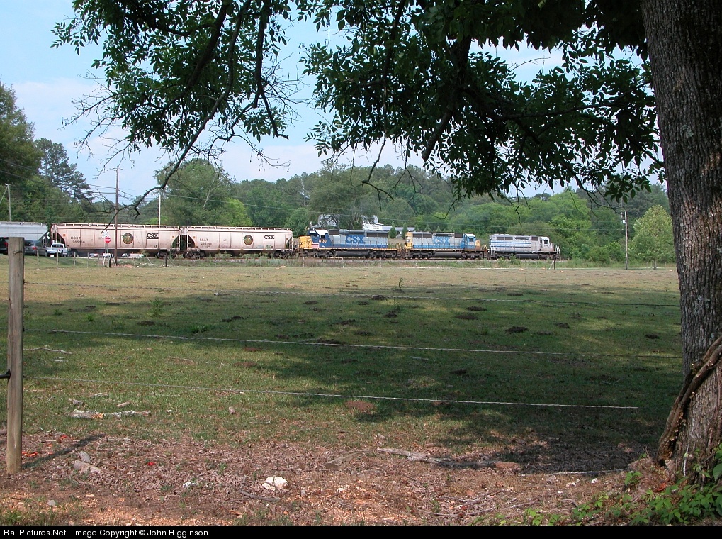 | A unit grain train from CSX passes a cow pasture as it backs down to Tyson's feed mill in Ivalee, running over a short branchline which comes off the ATN near Attalla; the branch to the feed mill is all that remains of a former L&N line which used to go all the way to Birmingham via Oneonta. |