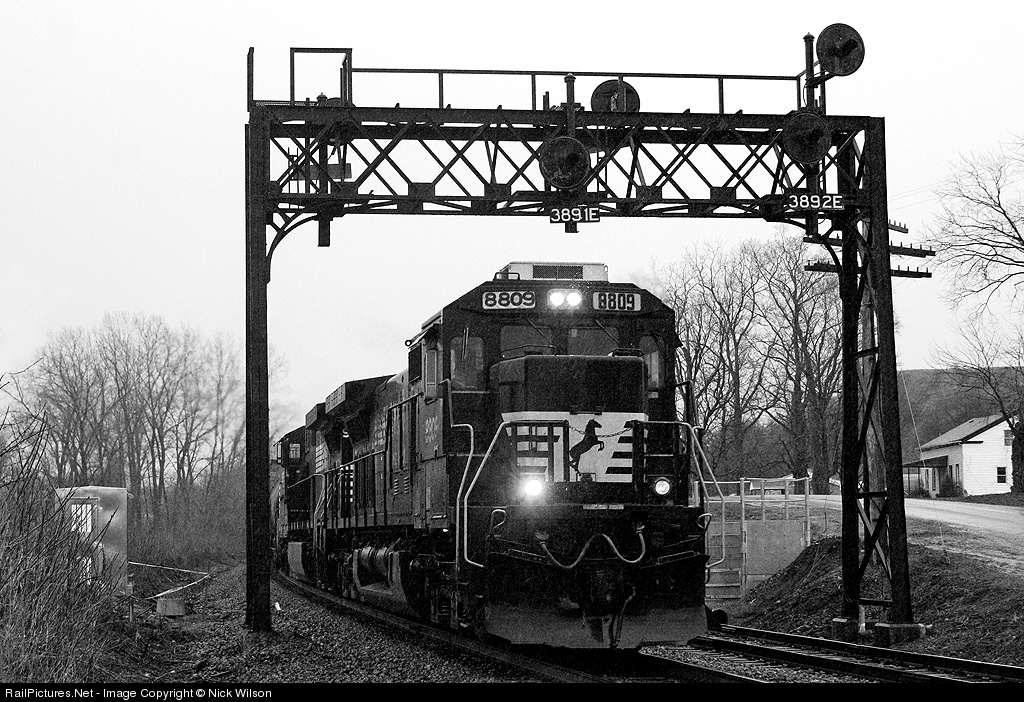 NS 309 rolls through a torrential downpour as it passes beneath an old Erie signal bridge. This particular signal bridge was recently replaced along with many others along this line. Under Conrail, many of the Erie landmarks remained, including the infamous semaphores, but under Norfolk Southern, the line is quickly becoming modernized.