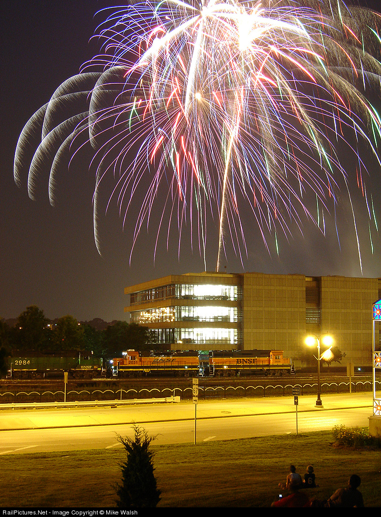 A trio of geeps wait in BNSF's Lower Yard, as fireworks explode above the Mississippi River.