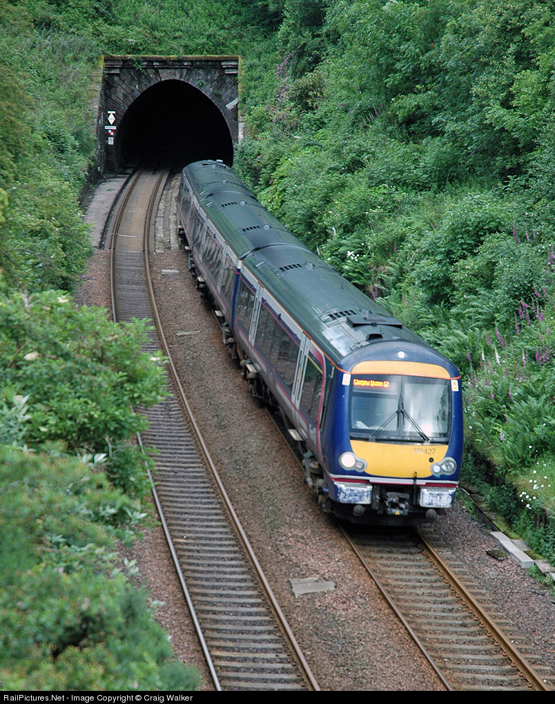 | Scot Rail 3-car MU set 170427 emerges from Falkirk Tunnel as it breaks for its stop at the Falkirk High Station, about midway between Edinburgh and its final destination of Glasgow. |