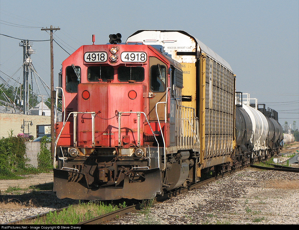 | CN train 500 has just arrived from Flint and is proceeding back into the yard to setoff their cut of cars and to make a pickup. The GTW orange on this unit seems to have been weathered into a shade of pink. |