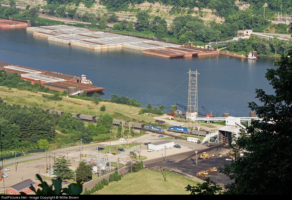 Looking at the River Harbor of the Ohio Valley Transloading Company as loaded train passes empties with a couple of former Conrail SD40-2's as power.