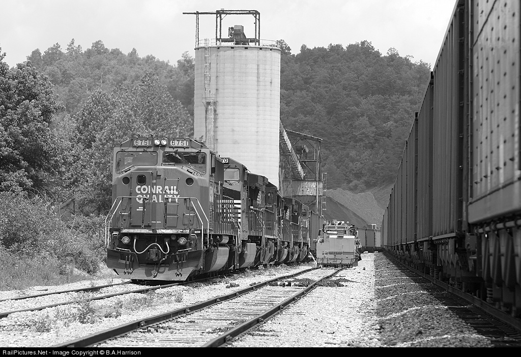 With six engines for power and two old Conrails, 77G backs uphill to load six cars of coal at a time. The second half of the unit train sits on the Jellico Branch main, while the center siding stores track equipment, needing after several derailments.