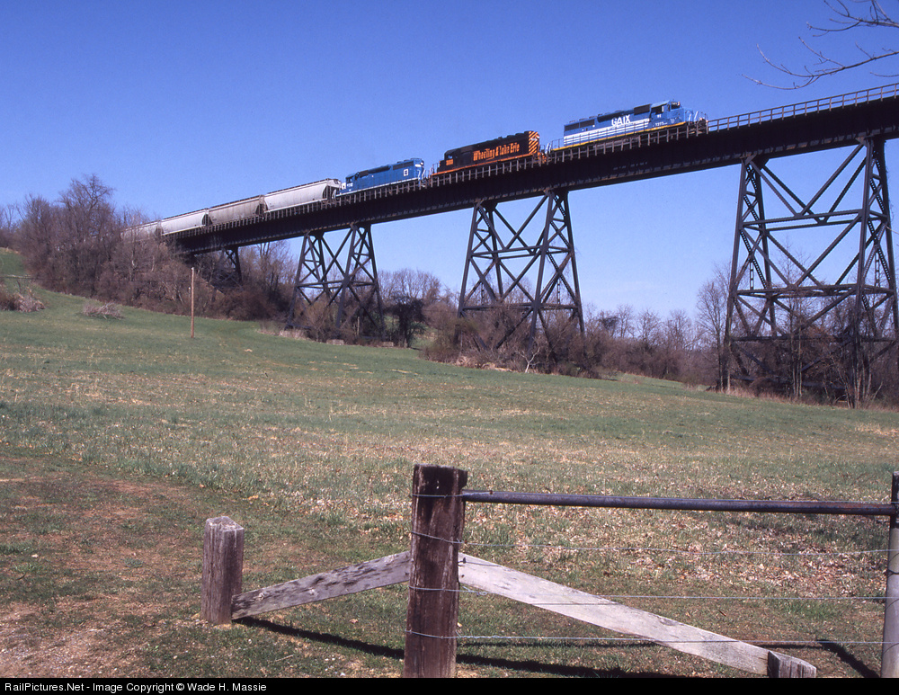 A Connellsville grain train starts across the massive Sudan Viaduct, one of several large bridges on the W&LE's east end.