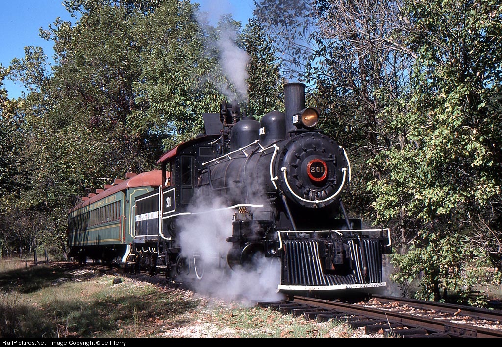 | ES&NA No.201 departs the former main line junction heading back towards Eureka Springs. No. 201, built for service in Panama, is today stored out of service at Eureka Springs. |