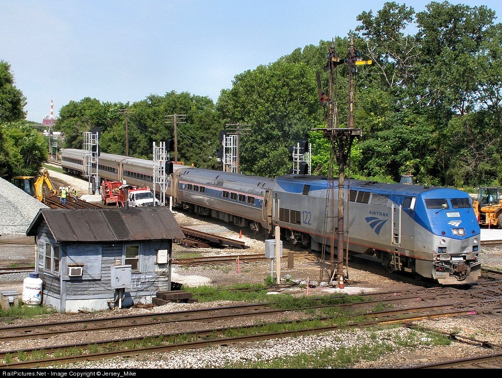 | All track work comes to a halt as Amtrak Lincoln Service train #351 roll past the semaphores at BRIGHTON PARK. The switchtender in the shanty had delayed an NS freight for over 30 minutes to give this Amtrak train the priority. Will Amtrak enjoy the same level of service now that the crossing has been remote controlled? |