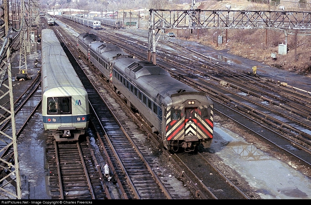 During a winter thaw, we see two Conrail local trains at Harmon NY, one made up of Budd Metropolitan (M-1) cars in MTA colors, the other Budd RDC1s (Beeliners) in New York Central colors. The RDCs are bringing train 8830 in from Poughkeepsie. The Metropolitans date from 1971-1973. The Beeliners are from 1950-1953. Today, they are all gone.