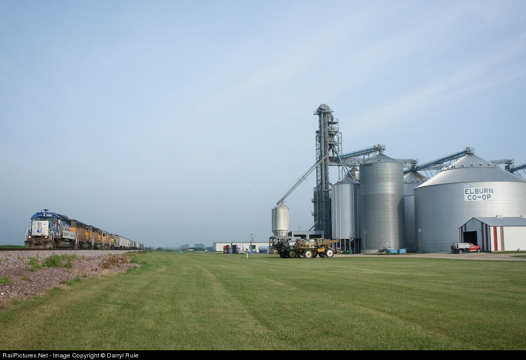 The UP United Way engine leads a mixed freight past the Elburn CO-OP at Meredith, IL on a beautiful summer morning.