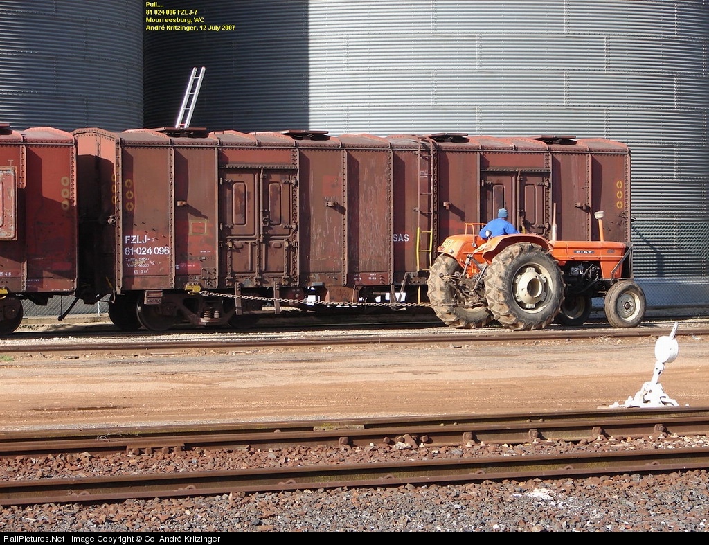 | (1 of 3) A tractor, chained to the first wagon, is used to pull short strings of grain wagons in position under the loading chutes of the grain silos at Moorreesburg Station. |