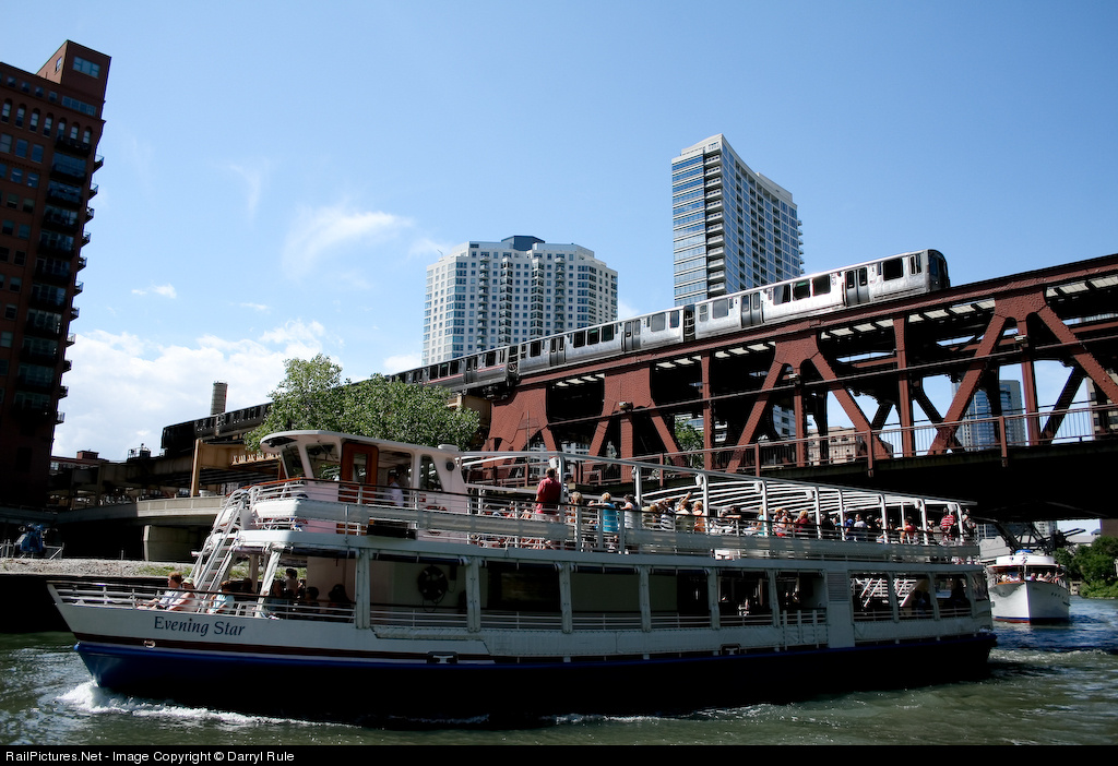 As the "Evening Star" gives tourists a tour of the Chicago River, an El hurries workers home during the afternoon rush.