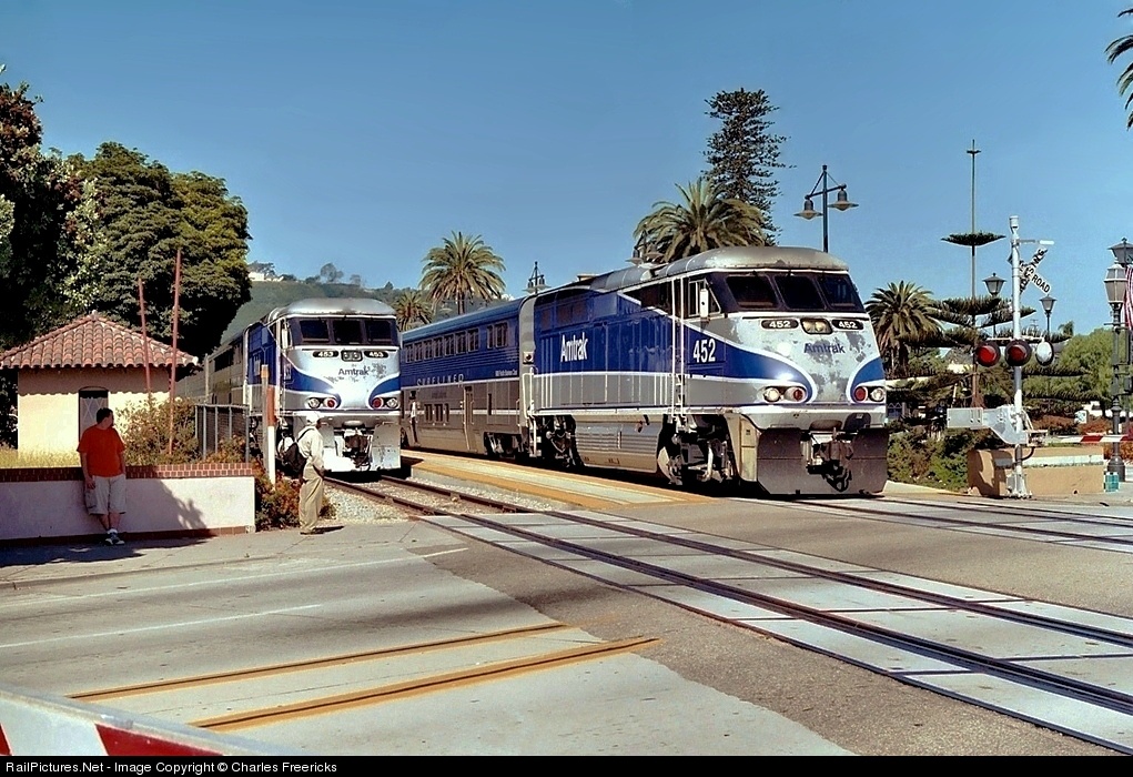 | Amtrak California Pacific Surfliners 763 and 774 meet at State Street in Santa Barbara. These units are sometimes called "Chevy Luminas" by engineers who complain that they run much like their GM cousin, the unloved Lumina APV mnivans of the 1990s. They were delivered in May and June of 1998 and their paint is oxidizing in the California sun. Train 763 on the right is a San Deigo to Goleta run. Train 774 on the left is a San Luis Obispo to San Diego run, aka the "Central Coast Surfliner." |