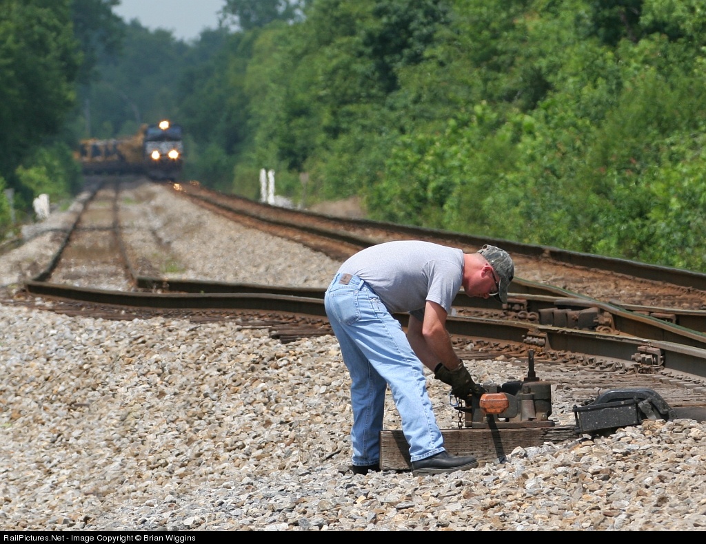 The conductor from NS train 112 throws the switch to take the siding ahead of train 283
