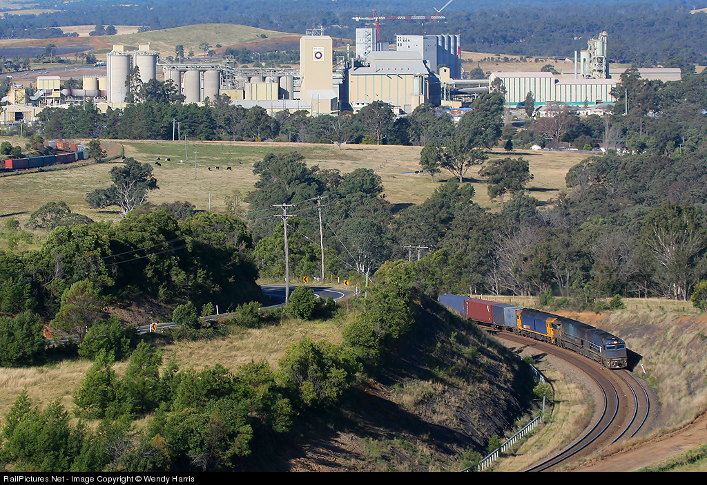NR56 leads 2 other engines around the curve through Picton with Maldon cement works the big building in background,this train is 1.5km in length and heading interstate.