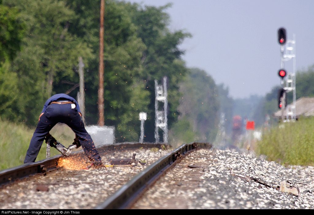 Sparks fly as a CSX MOW crew member uses a grinder during rail repair. Waiting for clearance about 2 miles off in the distance is CP's X500 en route to Montreal.