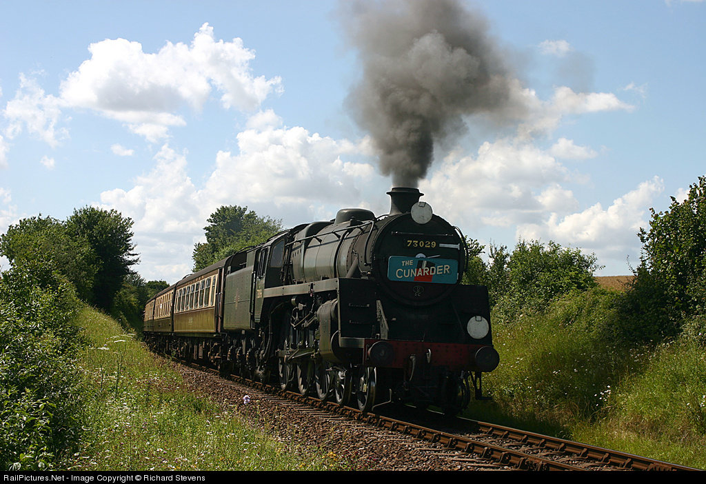 | Recreating a Southampton Docks Boat Train, Standard Class 5 73096, with dummy 73029 numberplate, approaches Ropley on the Mid Hants Railway. |
