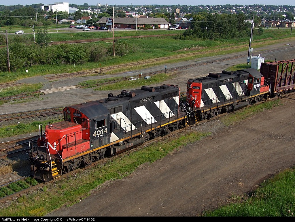| "The tri weekly Atikokan Turn to serve two sawmills; Atikokan Forest Products Western, and Fibratech." Prior to departure the CN 4014 + CN 4028 switch some cars at Northern Wood Preservers before heading across town to Neebing Yard to pick up a cut of cars before leaving the city. With the recession, both sawmills have closed and the "Atikokan Turn" is now history. |