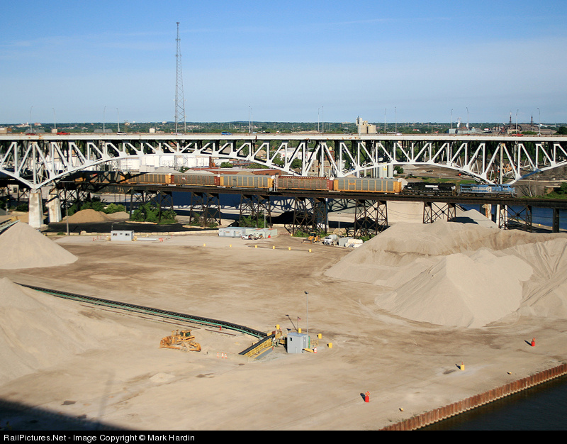 An as needed Buffalo to Toledo empty autorack train rumbles across the old NKP viaduct over the Cleveland Flats.