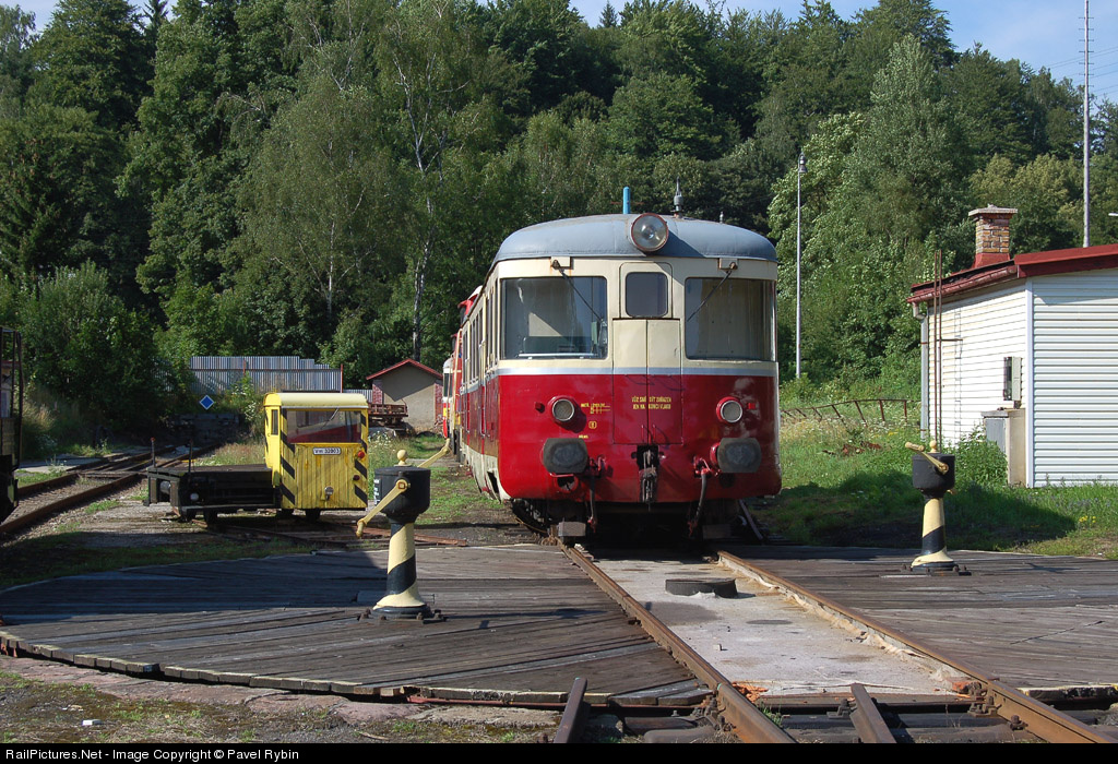 Museal passenger car Czech Railways M240.0057 (820 057-8) waiting in depot Tanvald beside small old dresine. Very old hand controled turn-table in front.