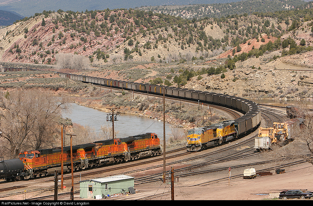 A northbound Union Pacific coal train and a southbound BNSF freight train meet at the yard in Bond.