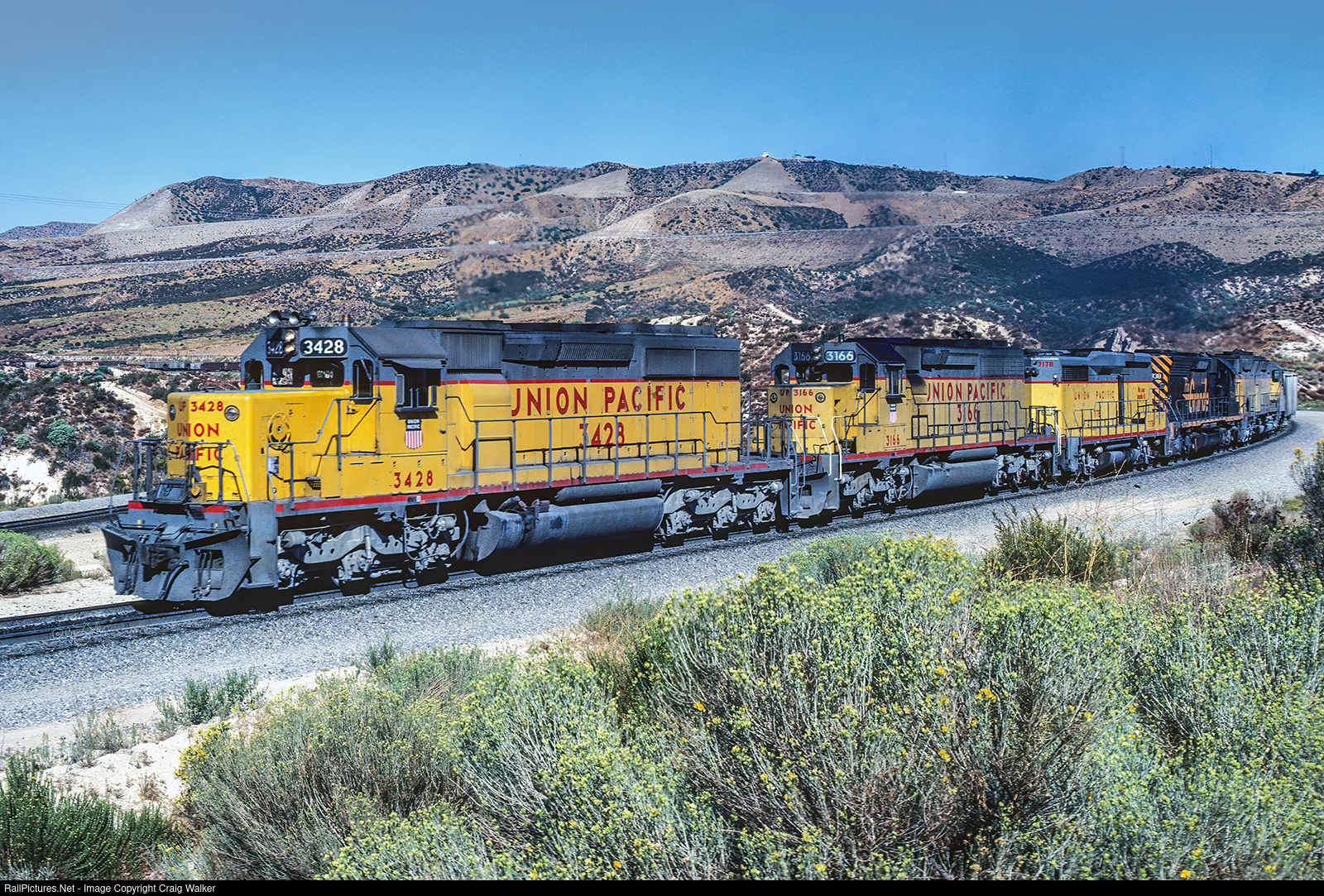 In the 1970s, Union Pacific put together some amazing locomotive consists, as evidenced by this eastbound freight photographed near Cajon Pass' Summit: UP SD40-2 3428, UP SD40-2 3166, UP GP30B 717B, D&RGW SD45 5338 and UP DD35A 78. On the Union Pacific in 70s, this kind of variety wasn’t unusual. (Cajon Pass, California – October 1, 1979)