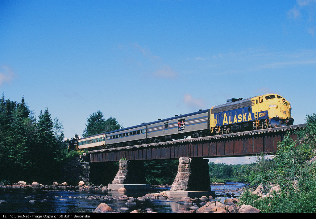 The Saturday morning Utica train makes its way north through the Adirondack Park on its way to Thendara, lead by power still in the completely untouched paint of its previous and original owner, Alaska RR. Due to a major washout on the MA&N line south of Holland Patent, this train originated out of Remson for most of the summer of 1999.