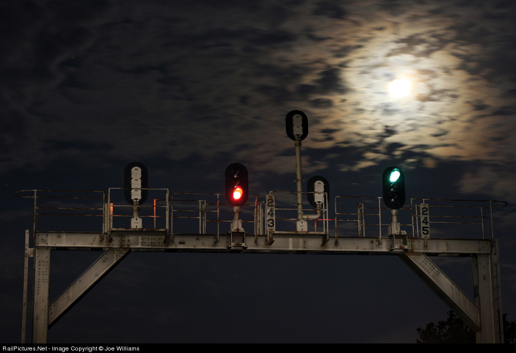 | The moon crests over this NS signal bridge 24 miles south of Cincinnat on the CNO&TP. These signal bridges are slowlyissapearing as they are replaced by the newer Safetrans style. |