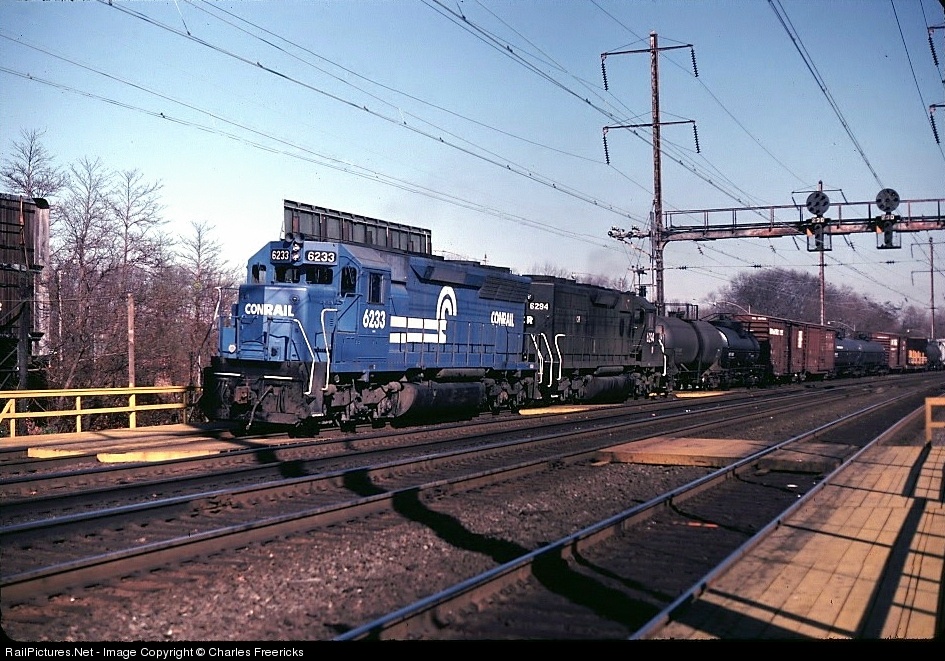 Conrail tried to use electric motors instead of diesels as much as possible when running under the wire, but this train from Harsimus Cove in Jersey City to Potomac Yard in Crystal City VA was uner the charge of two six-axle EMDs. Among the locomotives Conrail rostered, the flares, like former Penn Central SD45 #6223 here, wore the Dress Blue particularly well.