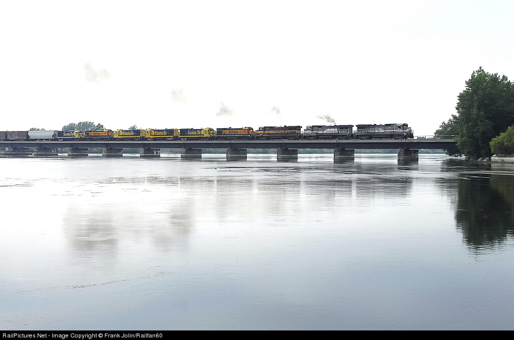 Brewing thunderstorms all around as MMA Extra 8578 South crosses the Richelieu River with six BNSF B23-7's in the consist