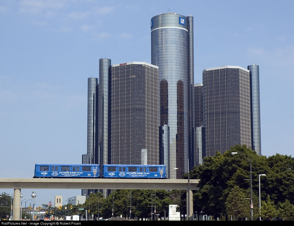 The massive GM Renaissance Center provides a backdrop for the routine passage of the Detroit People Mover. The central 73-story building is considered the tallest hotel in the Western Hemisphere.