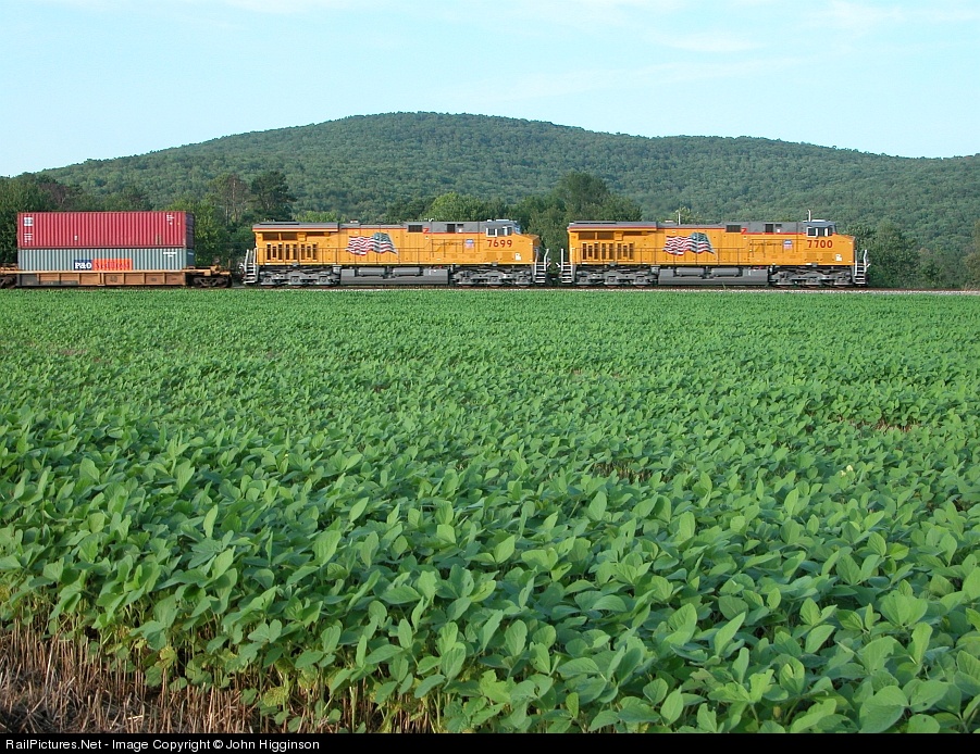| Two brand new UP units, the 7700 and 7699, lead an eastbound intermodal through fertile farmlands east of Huntsville. |