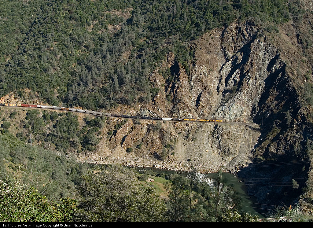 Near Poe, CA a Gevo leads a manifest down the Feather River Canyon.