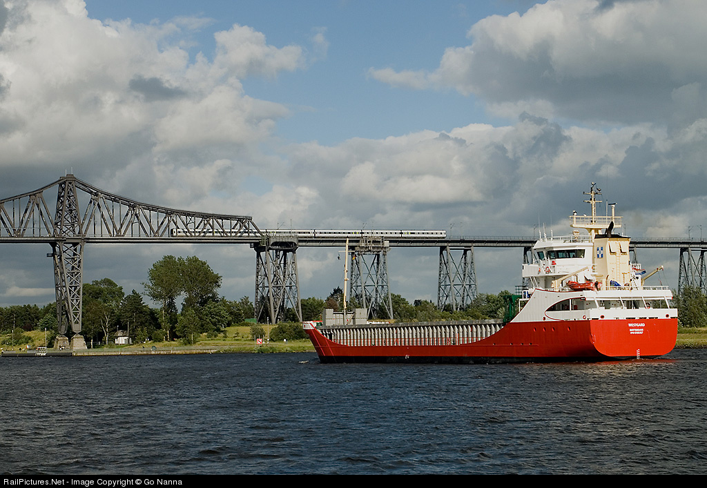 | DSB DMU IC3 heads south (right) to Hamburg over the Nord-Ost See (Kiel) Canal, which is known as Rendsburg high bridge in northern Germany. An empty container ship comes acoss the train at the right time and position with rare sunlight on the day! |