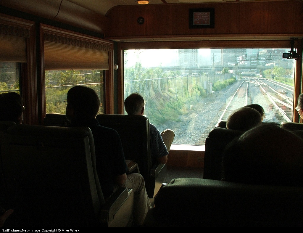| A rare view from inside the WSOR theater car "Stone Gardner" during a trip for the TRB's AR040 Committee. The train has just left Union Station and is winding its way through the complicated trackage outside Chicago Union Station. |