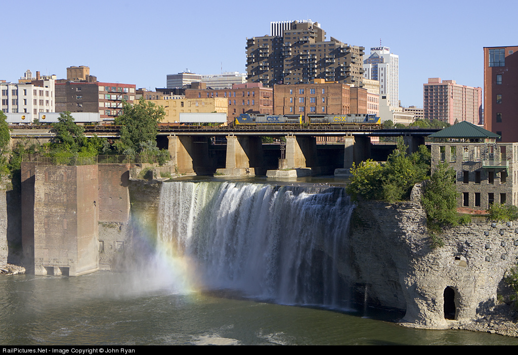 A westbound CSX intermodal train crosses the High Falls in Rochester, New York, just a stone's throw from Kodak World Headquarters. As a sign of the times, a Kodak product was not used to record this image.