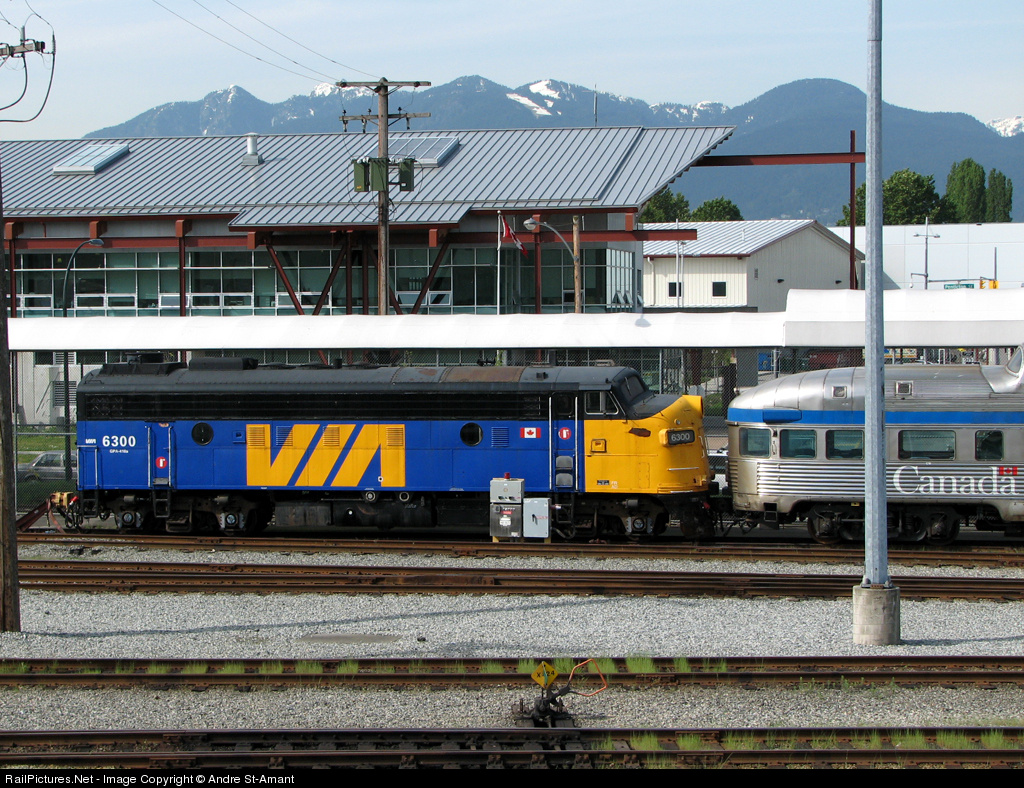 | The only FP9u unit left on the VIA roster, #6300 is at Vancouver and is occasionally utilized as a shop switcher at the VIA maintenance center (seen here coupled to a PARK car) |