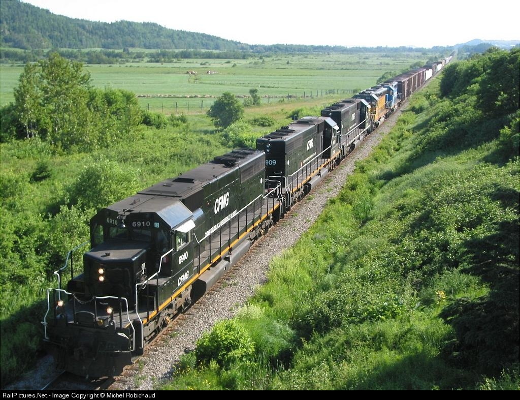 | CFMG SD-40 6910, 6909 and 6903, along with leased UP 2816 and GATX 7367 are pulling a long train on this beautiful June morning. |