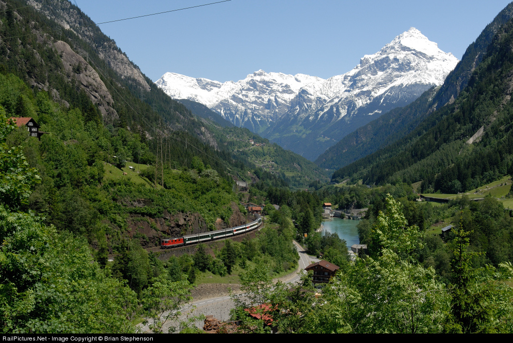 | In the same location as SpirosN's shot of the Cisalpino in the snow below Wassen, an Re 4/4 II heads the 10.04 Basle to Locarno train on the northern ramp to the Gotthard tunnel. |