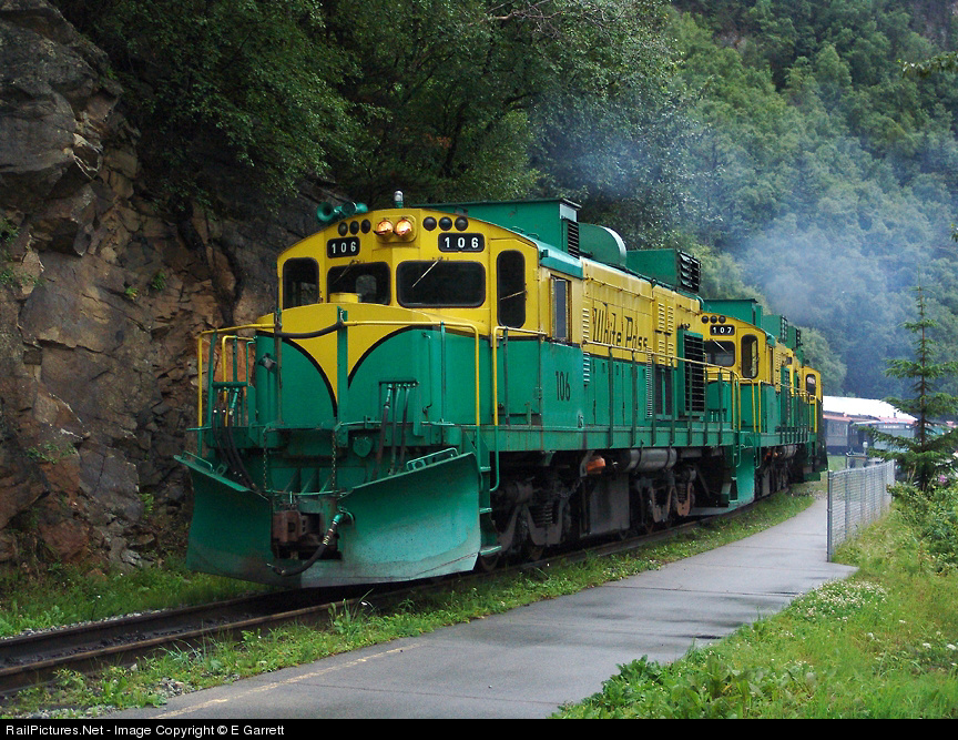 Alco 106, with sisters 107 and 109, return from the cruise ship docks to fill out the train's complement of passengers before the 8:15 excursion to White Pass Summit. Ah, railroading in a rain forest!