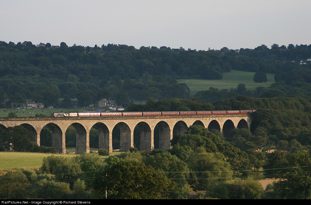 A4 'No.9' catches the light as it drops down from Bramhope tunnel across Arthington viaduct with the returning Scarborough Spa Express.