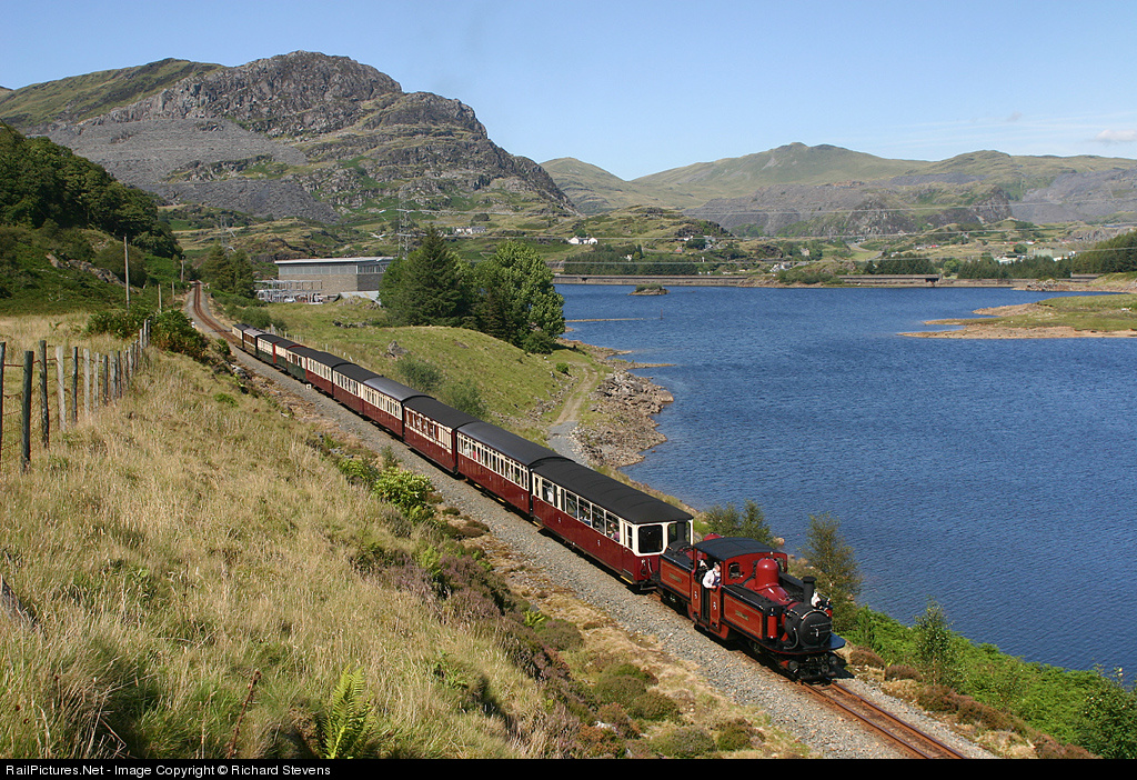 'David Lloyd George', one of the Double Fairlie type unique to the Ffestinog Railway, is seen in spectacular countryside soon after leaving Tanygrisiau with a Porthmadog bound train. The train is travelling on "The Deviation", a new route built almost entirely by volunteer labour between 1965 and 1978 to bypass the hydroelectric power station and its associated lake which are prominent in this picture. The lake had flooded the original formation, which can be seen above the first and second coaches of the train.