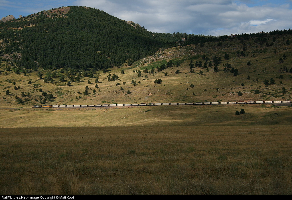 A loaded coal train heads out of the shadows and into the sun as it heads downgrade toward Denver.