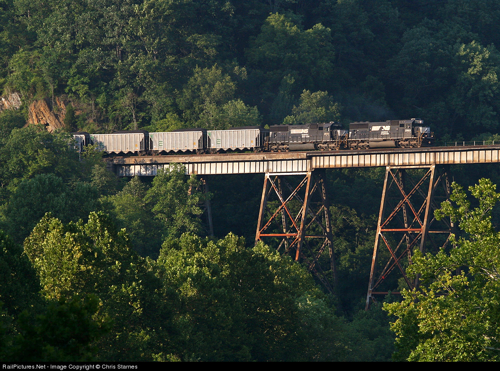 NS 2569 leads loaded coal train 724 southbound across the Copper Creek Viaduct at Clinchport.