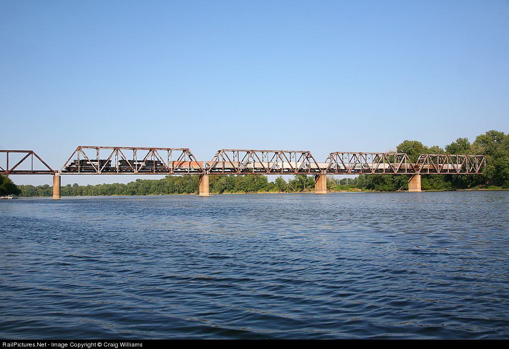| A westbound local crosses the Wabash River with 10 cars in tow. D68 is heading out to Albion, IL to do work. The local has just left the state of Indiana behind and is now in the state of Illinois. |