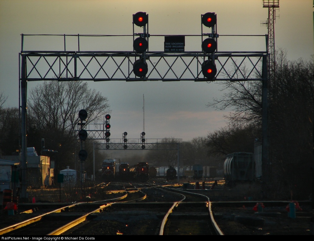 3 trains await on the other side of West Toronto to go eastbound as cherries on both westbound signals protect the Galt Sub as the sun sets to produce a moody scene over the diamond.
