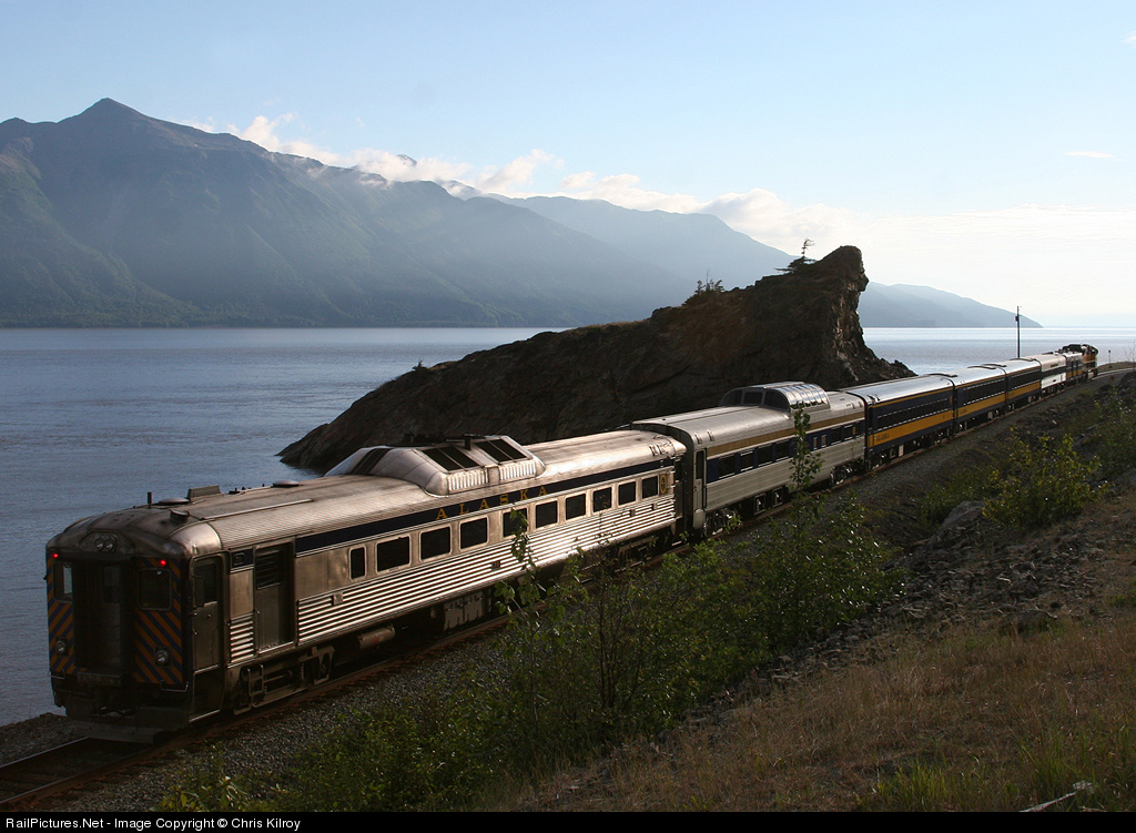| 56 year old RDC-2 #711 (originally built in 1951 as New York, New Haven & Hartford Railroad #121) brings up the rear of the northbound ARR Glacier Discovery Train as it heads north along the scenic Turnagain Arm. This RDC acts as a cab car for the middle leg of this three point service, with the lead SD70MAC shoving from Whittier to Grandview. |