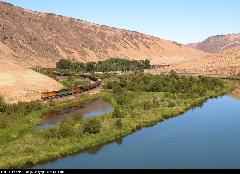 | Eastern Washington basalt jets upward and the Yakima River digs downward. 4 cars in latter half of the grainer are visible just around the river bend. A very lucky catch on my way back to Pullman. This shot was 5 years in the waiting! |