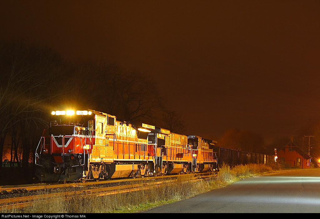Providence & Worcester RR B40-8 #4001, B30-7A #3006, and B39-8 #3908 haul westbound train CT-2X past the old New Haven RR station at Newtown, CT on the Housatonic RR's Maybrook Line on the night of December 12, 2006.